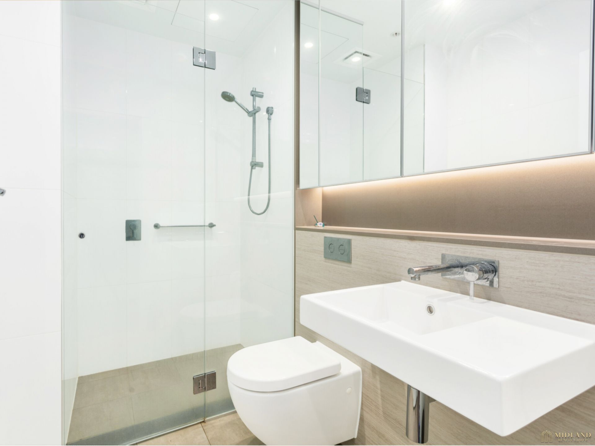 - Sleek bathroom with plenty of vanity storage