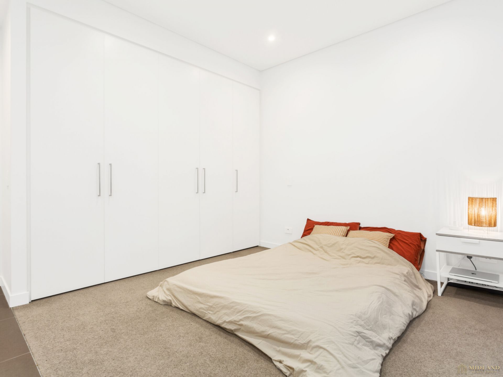 - Well-appointed bedroom with sliding privacy partition and built-in wardrobe