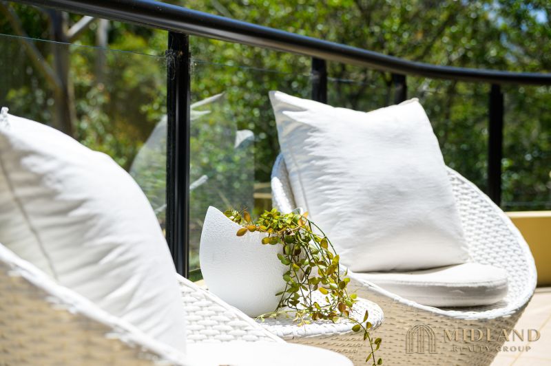 - Spacious living room steps onto wide balcony with leafy view