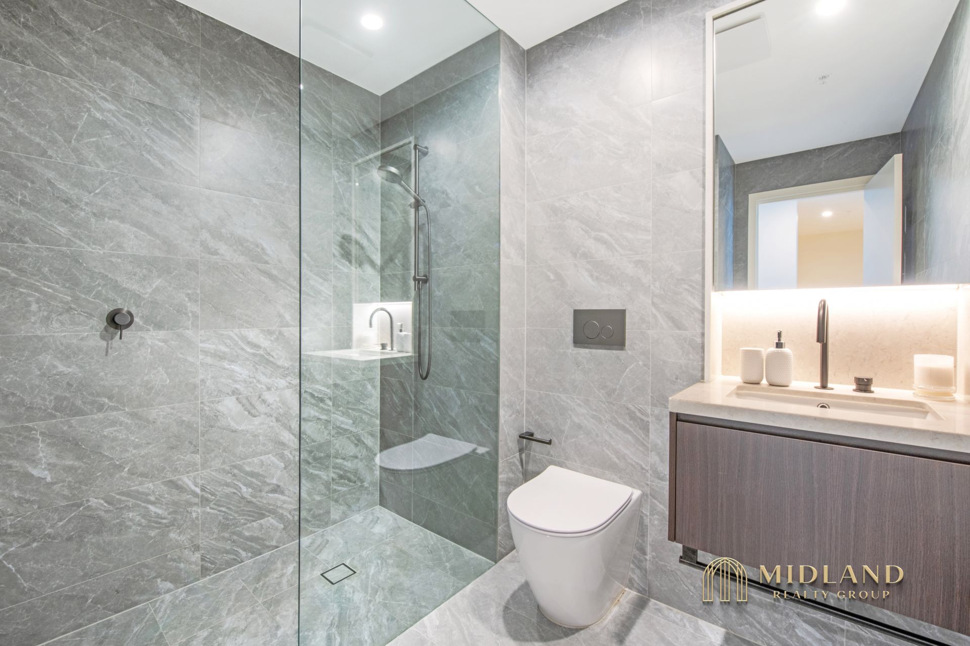 - Luxurious bathroom featuring gunmetal tapware and an European laundry with dryer
