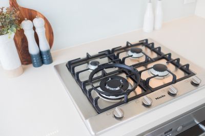 - Modern kitchen with stone benchtop and quality stainless steel Meile appliances