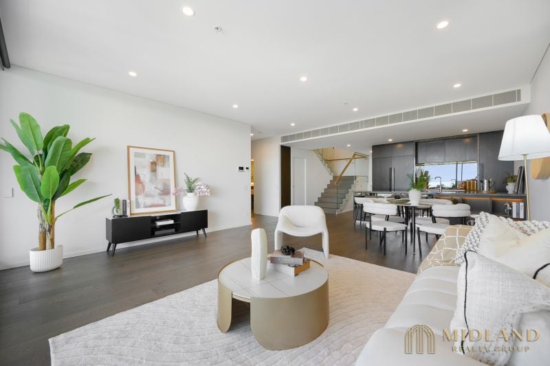 Upstairs features a second living room, two well-appointed bedrooms and a stylish bathroom, creating the perfect separation of space. A vast north-facing balcony captures expansive views towards North Head, while the interiors are finished with premium touches including timber flooring throughout, electrical blinds, a marble kitchen and high-end Miele appliances.